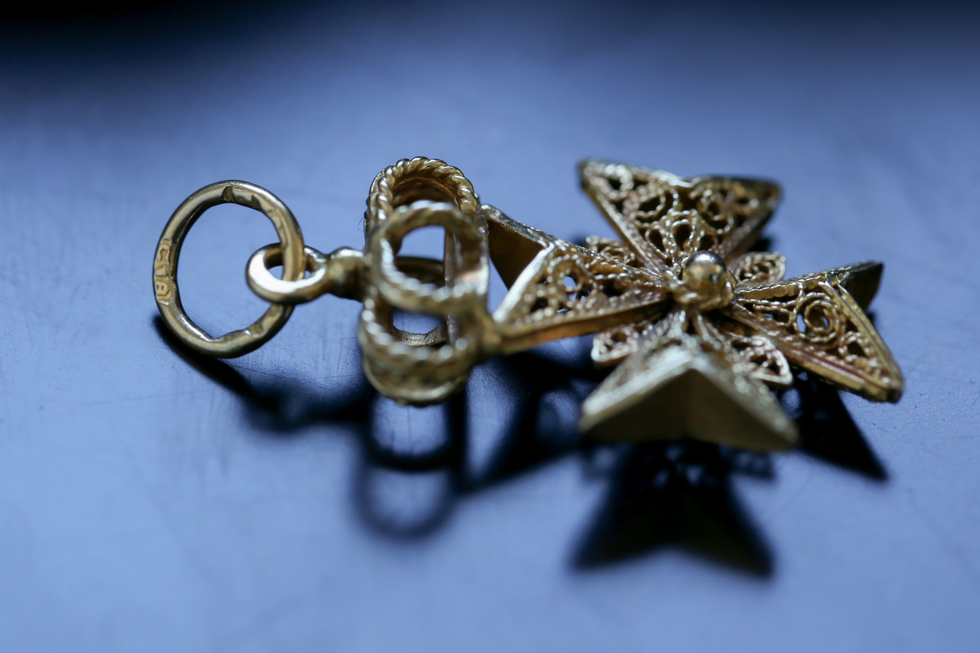20世紀初頭に作られた18Kゴールドのフィリグリークロスペンダント。上部分にクラウン(王冠)、メインはクロス(おそらくマルタ十字)のデザインで、遠目からは星のような形にも見えます。マルタ十字に王冠がついたデザインは伝統があるゆえに逆に新しくも感じます。デザインから察するにおそらく勲章的なものだったのかもしれません。男性にもおすすめのデザインです。また、緻密で繊細な金細工が美しく、毎日のコーディネートにアンティークらしさをさりげなくプラスしてくれそうなデザインです。金を糸のよう細かくして作り上げるフィリグリー細工が施されています。フィリグリー細工のアンティークジュエリーは段々出会うのが難しくなってきており、貴重な作品の一つでもあります。当時の職人の圧倒的な技術力が感じられる素敵な作品です。