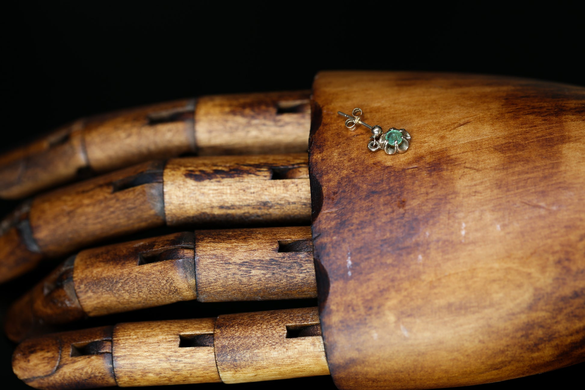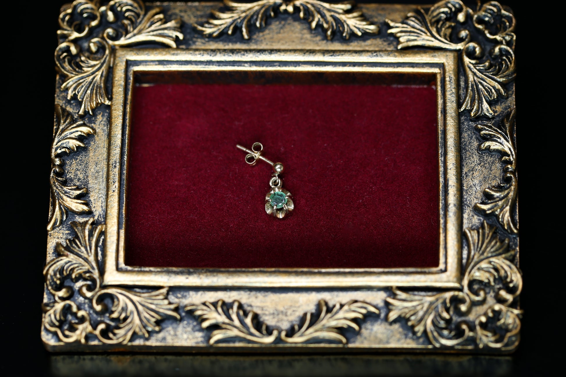エレガントなエメラルドのドロップピアス。1987年に作られました。5月の誕生石として有名なエメラルドですが、まずエメラルドと聞いて思い浮かぶのは、どの石も森を彷彿とさせるような癒しのグリーンカラーをしていることだと思います。身に着けるだけで日々の疲れを癒してくれそうなそんな雰囲気を感じさせます。ピアス全体のデザインは、一言で言うと”エレガント”。身に着けるとわずかに揺れるドロップピアスが優雅さを演出してくれます。エメラルドを花弁が包むようなデザインも、華やかさを感じさせます。また、比較的軽いので、ストレスフリーで身に着けられそうです。元々対のピアスでしたが、ご要望があり、試験的に価格を下げてシングルピアスで再販することになりました。