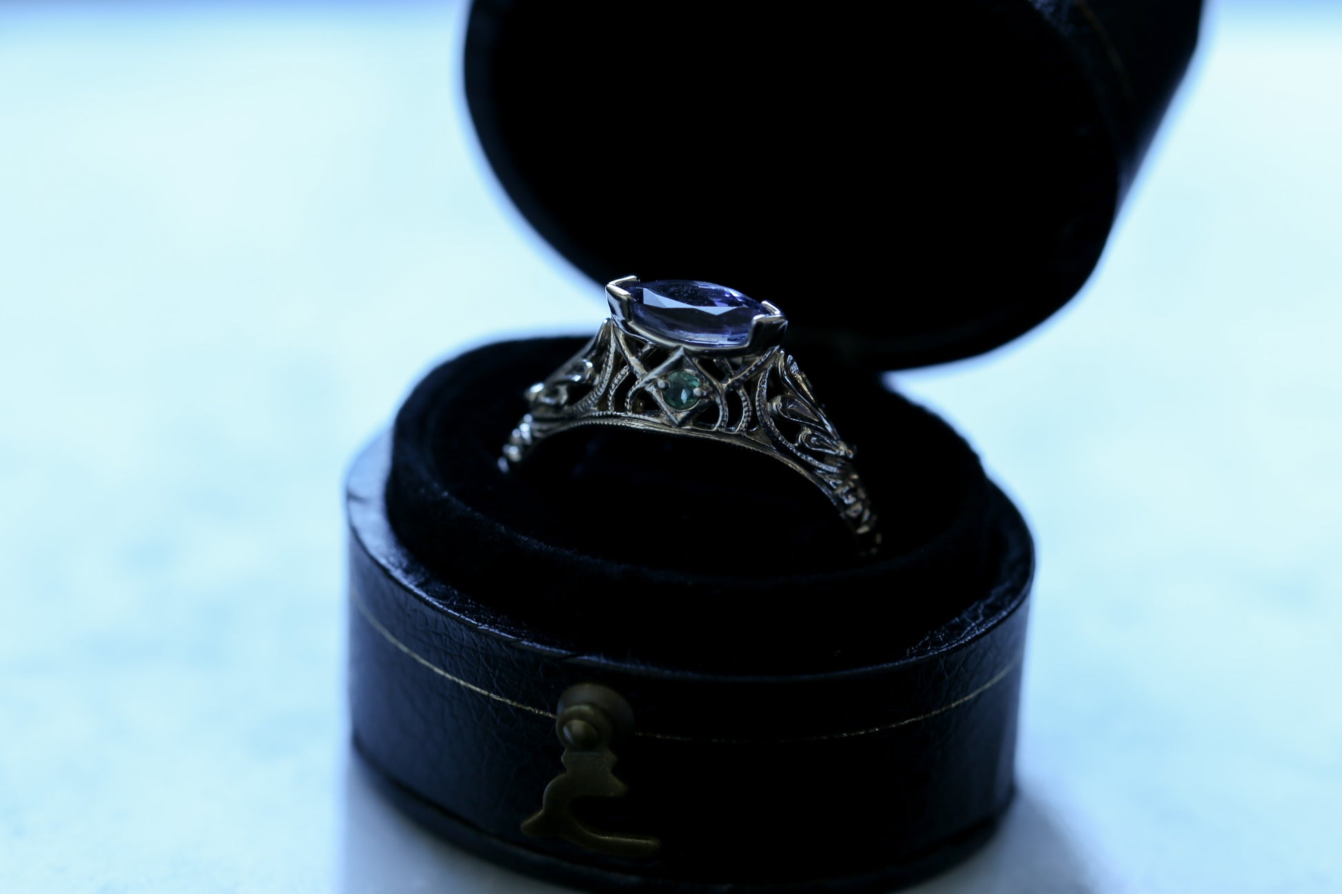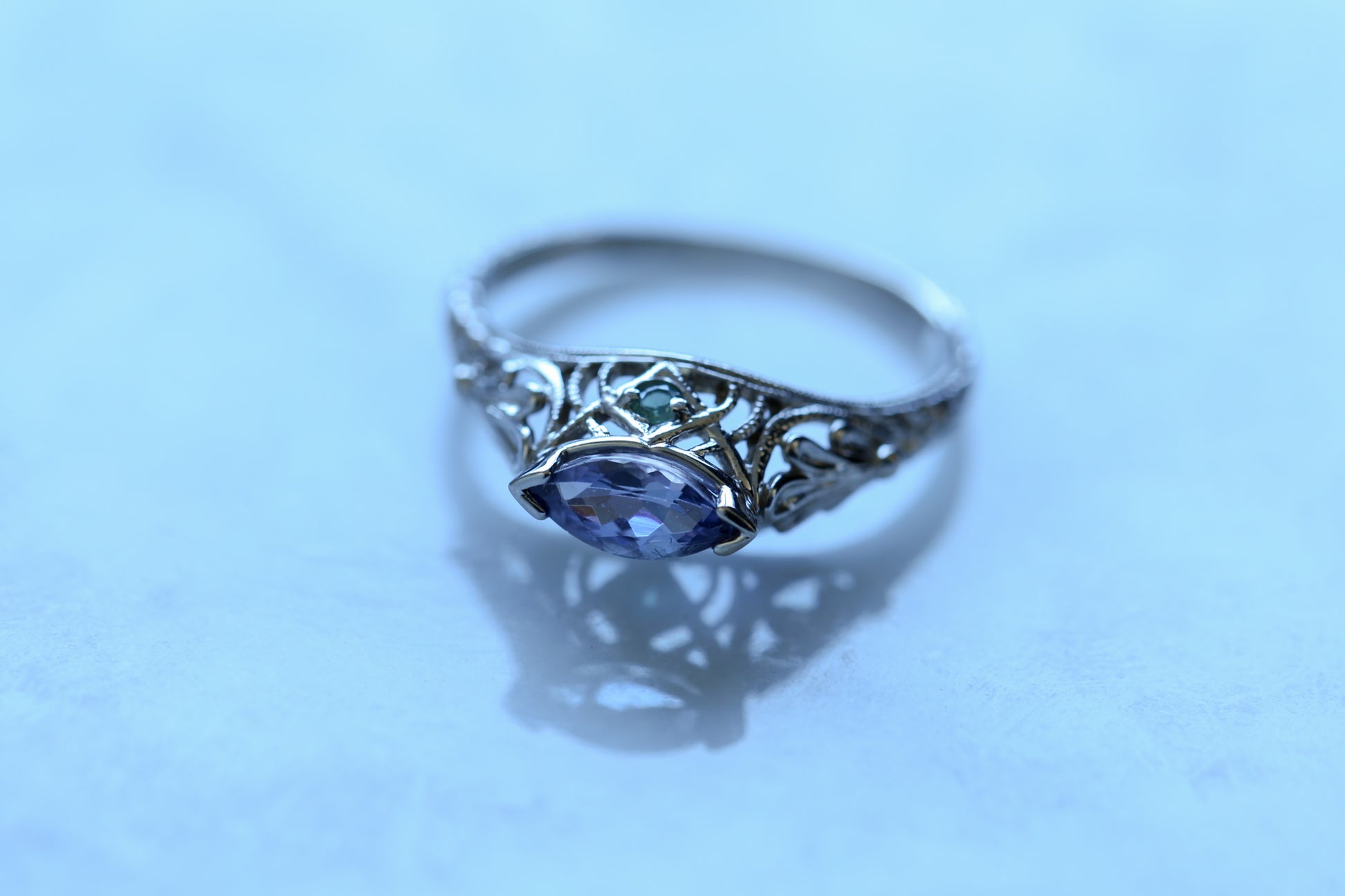 マーキスカットのタンザナイトが印象的なリング。サイドから見ると脇石にライトブルーグリーンのアレキサンドライトがキラリと輝きます。オープンワークの技術がふんだんに使われており、繊細な彫りが素晴らしく、どの角度から見てもうっとりするような美しいリングです。オープンワークとは透かし細工の技法で、古くは古代ローマの時代から用いられてきた技法。昔ながらの繊細で美しい技法を感じつつ、タンザナイトとアレキサンドライトという新しくも斬新な組み合わせにほれぼれするリングです。タンザナイトは12月、アレキサンドライトは6月の誕生石なので、この組み合わせに運命を感じる方に特におすすめのリングでもあります。こちらのリングには、ご希望の方には鑑別書がつきます。