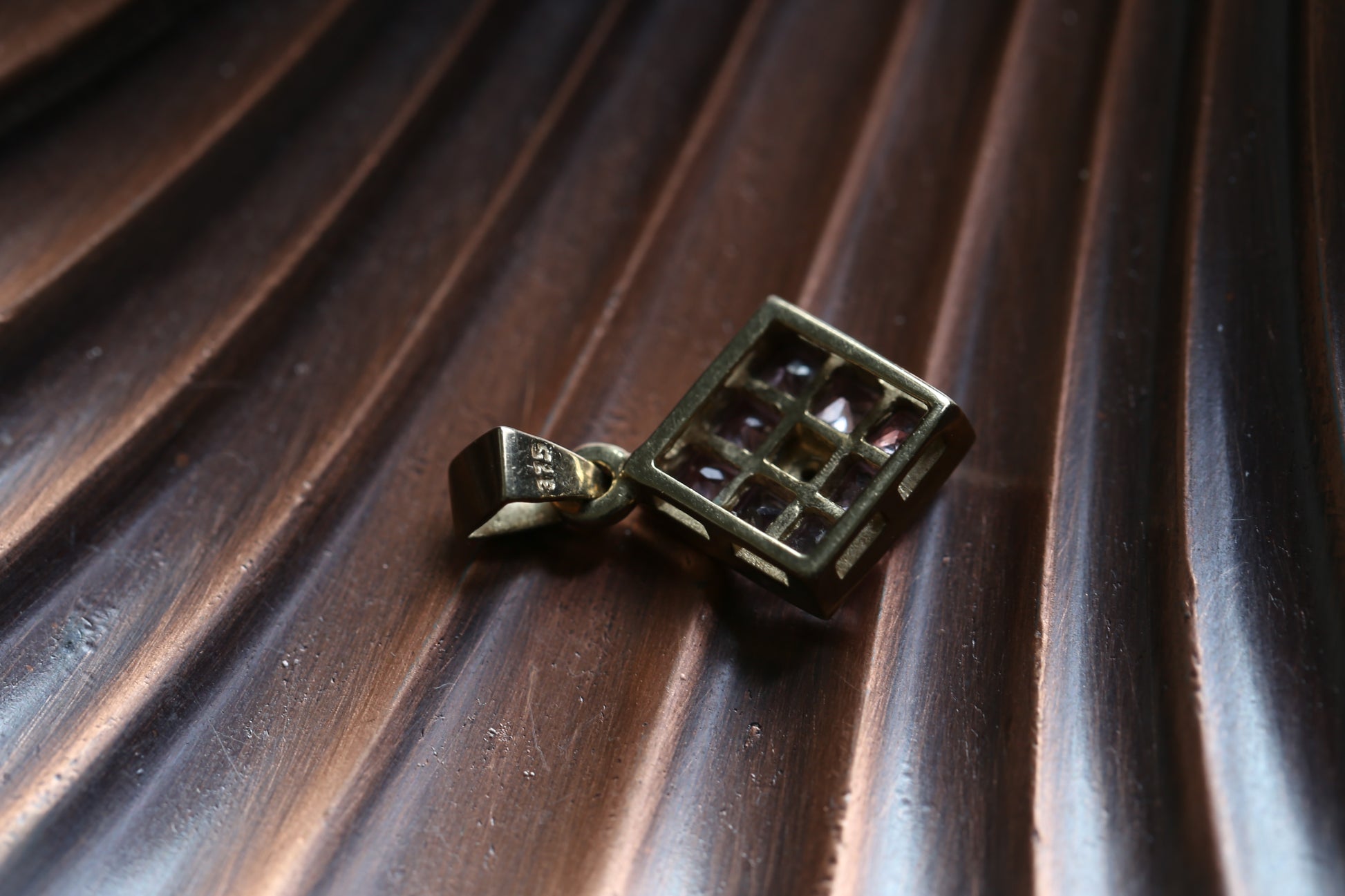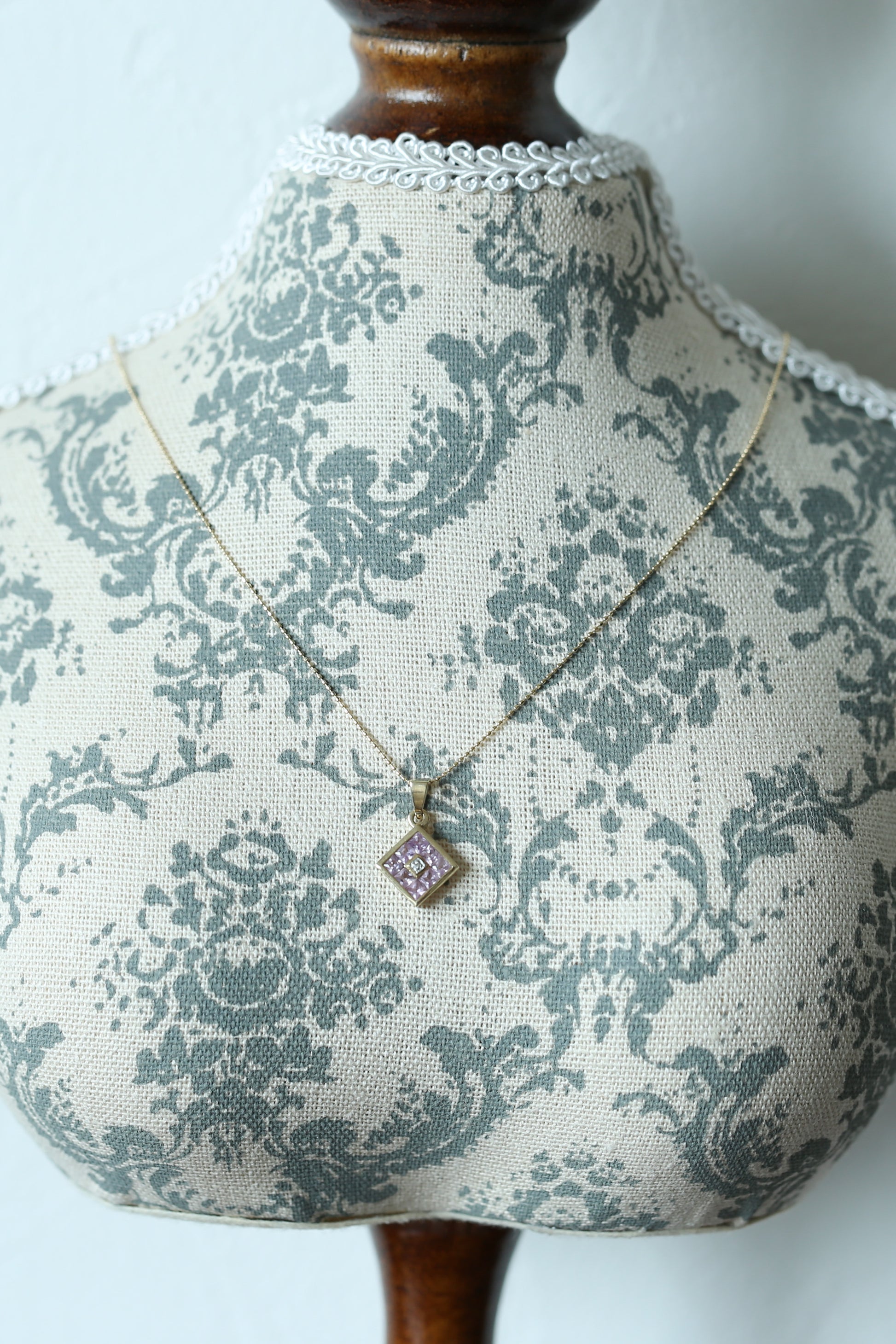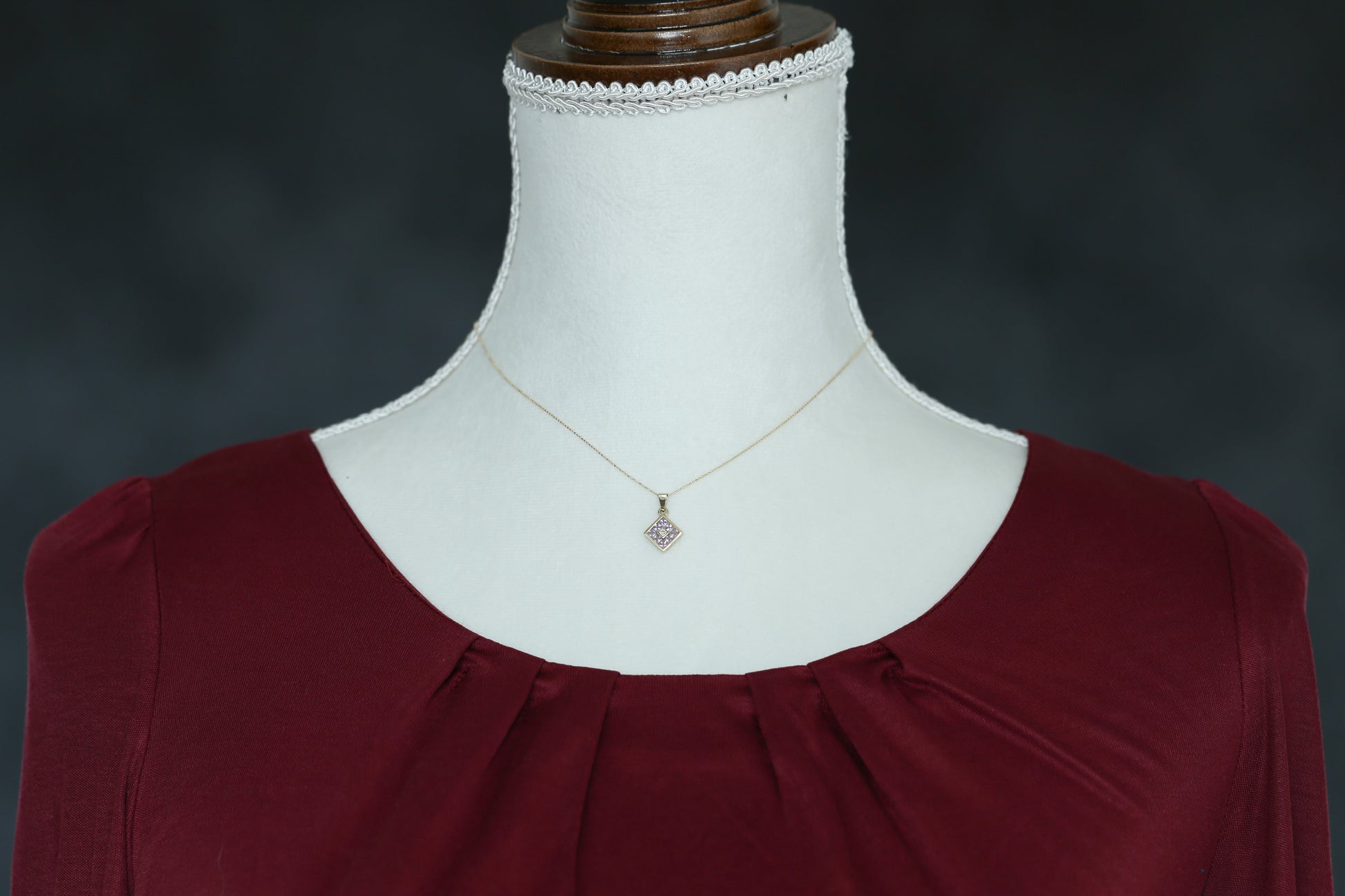 スクエアにカットされたサファイアがすっきりと美しく並べられたデザインのペンダント。爪止めを使わずに、宝石を隙間なく並べる石留めの技法「カリブレカットセッティング」が施されています。中央に輝く小さなシングルカットダイヤモンドも美しく輝いています。サファイアは明るく淡いピンク色で、UVライトを当てると少し強めのピンク色に輝きます。約1.7㎝と小さなペンダントですが、愛らしく、クラシカルな雰囲気で存在感があります。どんな服装にも合わせやすいデザインなので、さりげなくワンポイントにピンク色を入れたい方におすすめのジュエリーです。サファイアは9月の誕生石として有名で、最もポピュラーなカラーである青のサファイアは知的なイメージがありますが、こちらのピンクサファイアは”愛”を含む石言葉が多い宝石です。