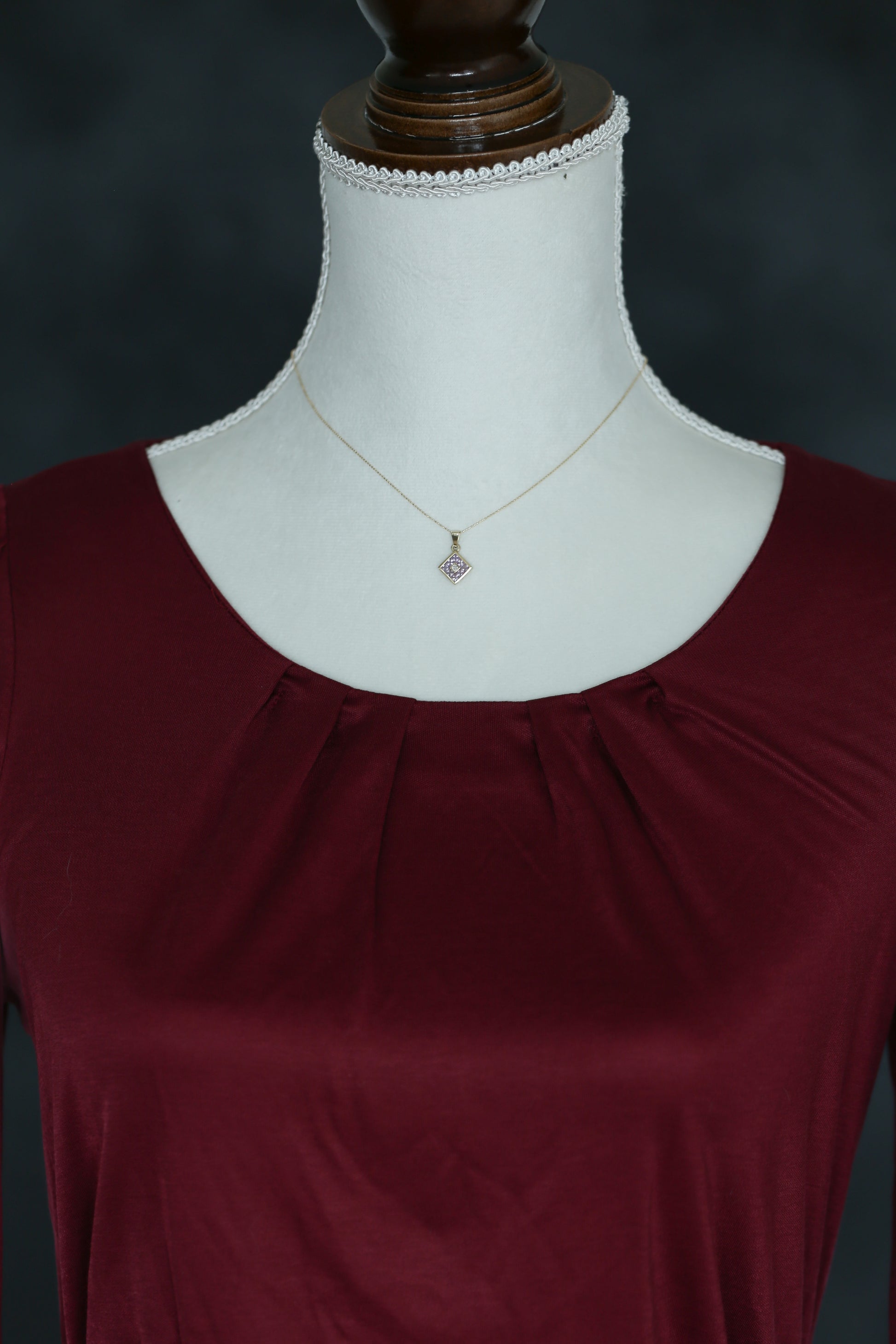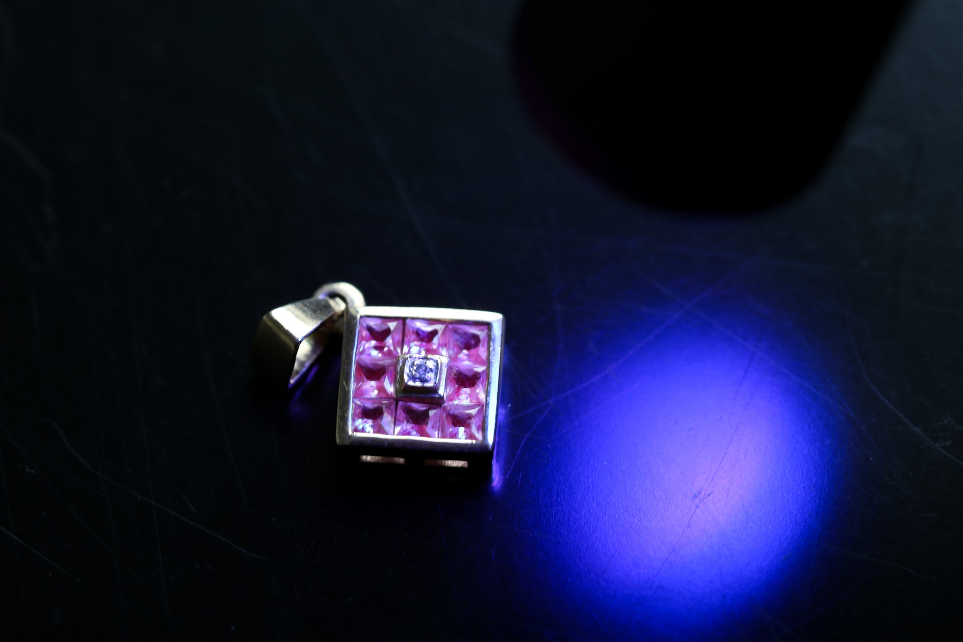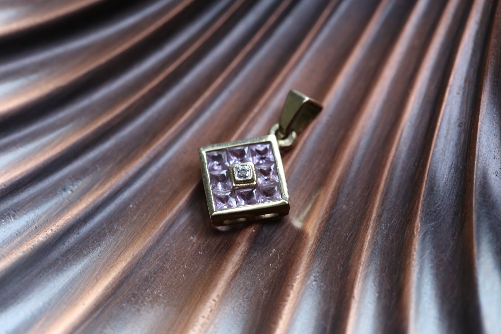 スクエアにカットされたサファイアがすっきりと美しく並べられたデザインのペンダント。爪止めを使わずに、宝石を隙間なく並べる石留めの技法「カリブレカットセッティング」が施されています。中央に輝く小さなシングルカットダイヤモンドも美しく輝いています。サファイアは明るく淡いピンク色で、UVライトを当てると少し強めのピンク色に輝きます。約1.7㎝と小さなペンダントですが、愛らしく、クラシカルな雰囲気で存在感があります。どんな服装にも合わせやすいデザインなので、さりげなくワンポイントにピンク色を入れたい方におすすめのジュエリーです。サファイアは9月の誕生石として有名で、最もポピュラーなカラーである青のサファイアは知的なイメージがありますが、こちらのピンクサファイアは”愛”を含む石言葉が多い宝石です。