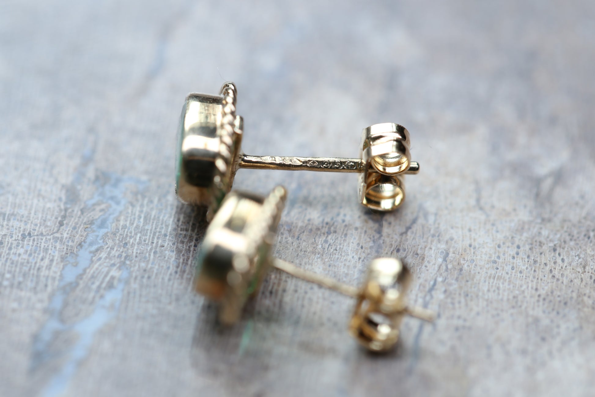 エメラルドのシンプルな9ctゴールドピアス。1996年に作られました。エメラルドを取り囲む9ctゴールドのデザインがクラシカルで、ヴィンテージらしさを感じさせます。長さは約0.8㎝と程よい大きさで、身に着ける人を選ばず、どのような服装にも合わせやすいシンプルなデザインです。ピアスキャッチが無い状態で入荷したため、新品の18Kゴールドのピアスキャッチをおつけしています。「1996年という生まれ年に運命を感じる」、「5月の誕生石」、「エメラルドが好き」など様々な方にご縁がありそうなピアスでもあります。ヴィンテージならではの小傷等はありますが、大きな欠け等はなく、比較的良好な状態のヴィンテージジュエリーです。