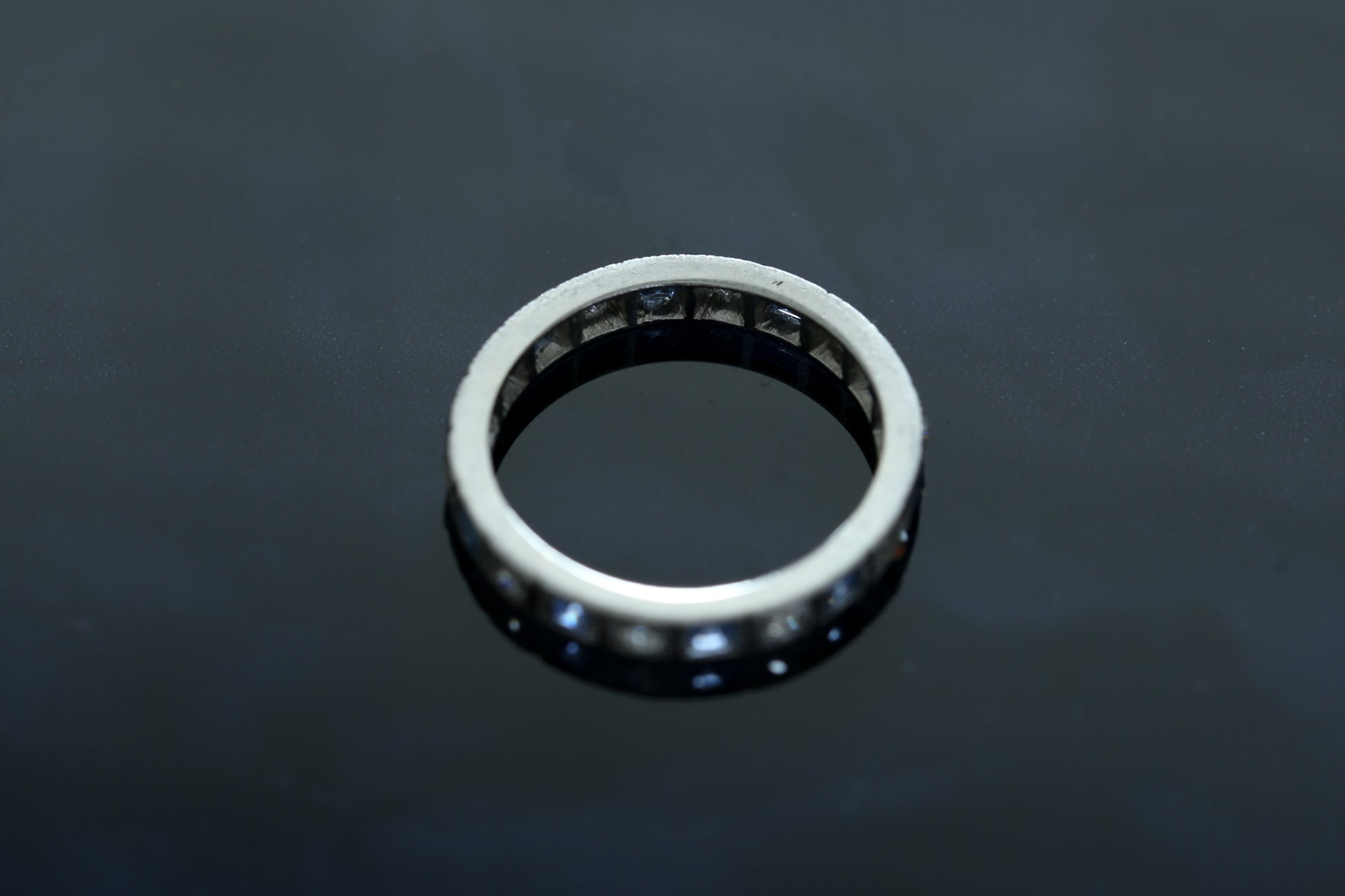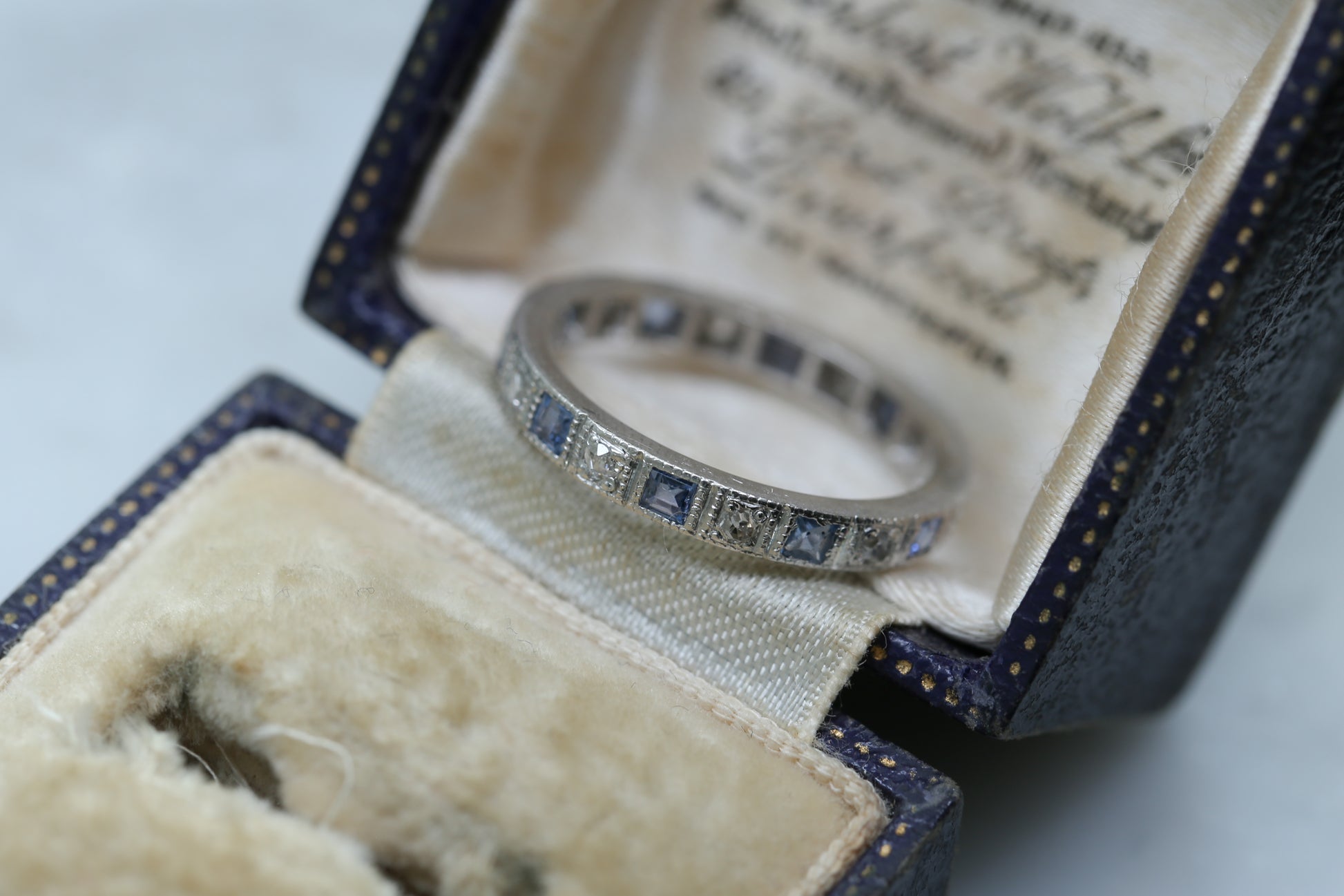 サファイアとダイヤモンドのフルエタニティリング。アールデコ期から20世紀半ば頃に作られたものと推測されます。ミルグレインがクラシカルな雰囲気のリングで、とても人気のデザインです。サファイアはライトからミディアムブルーで繊細な輝きを放っています。ダイヤモンドはトータルで0.1ct程ですが、こちらもしっかりと輝いています。地金はシルバー色で、刻印はありませんが簡易金属テストの結果はプラチナでした。所々ヴィンテージらしい小さな傷や欠け等があり、前の持ち主がとても気に入っていたことがわかる使用感です。凹凸の少ないデザインなので、日常で身に着けやすいリングだと思います。今回刻印がなく、地金の種類が推定であるため、通常よりもかなりお手頃な価格で販売することができました。ヴィンテージやアンティークのフルエタニティリングがお好きな方におすすめしたいリングです。